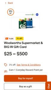Purchase Woolworths group gift cards at a discount through your rewards app and they will automatically appear in your app wallet. Discounts and offers vary from time to time, sometimes 7% off, but average 3-5%. At times there are extra points for buying them.